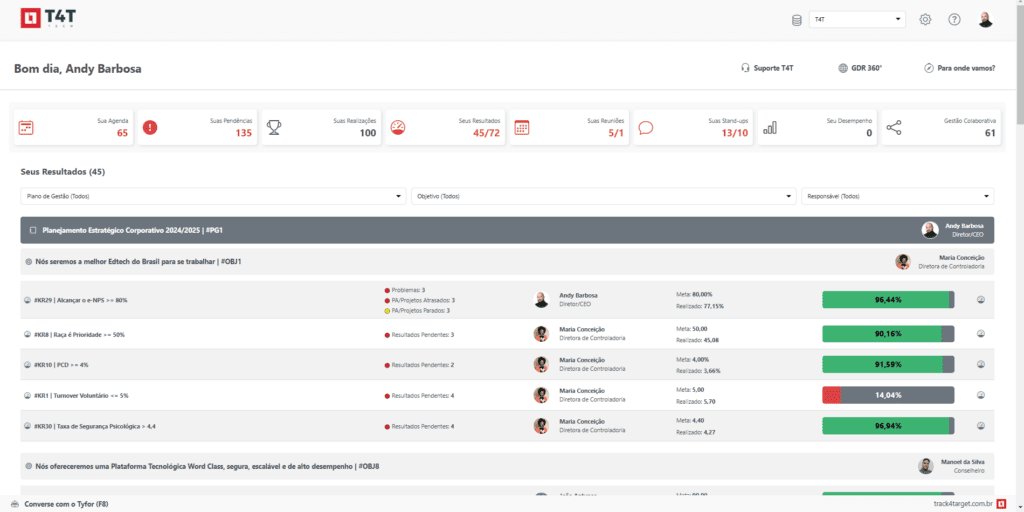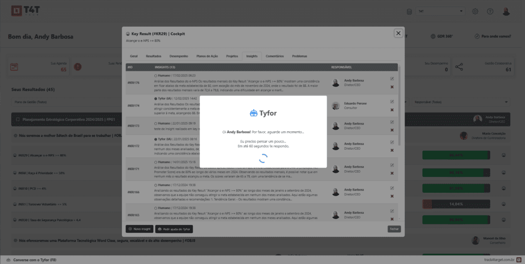 O Cockpit do Key Result é o centro de controle da gestão de resultados dentro da plataforma T4T GDR. Projetado para permitir um acompanhamento contínuo e estratégico dos indicadores, ele centraliza todas as informações relevantes para a análise de desempenho e tomada de decisão. Além do registro e monitoramento dos resultados, o módulo incorpora justificativas, evidências, gráficos de evolução, insights colaborativos e avaliação automatizada com IA, garantindo transparência e precisão na gestão dos Key Results.
