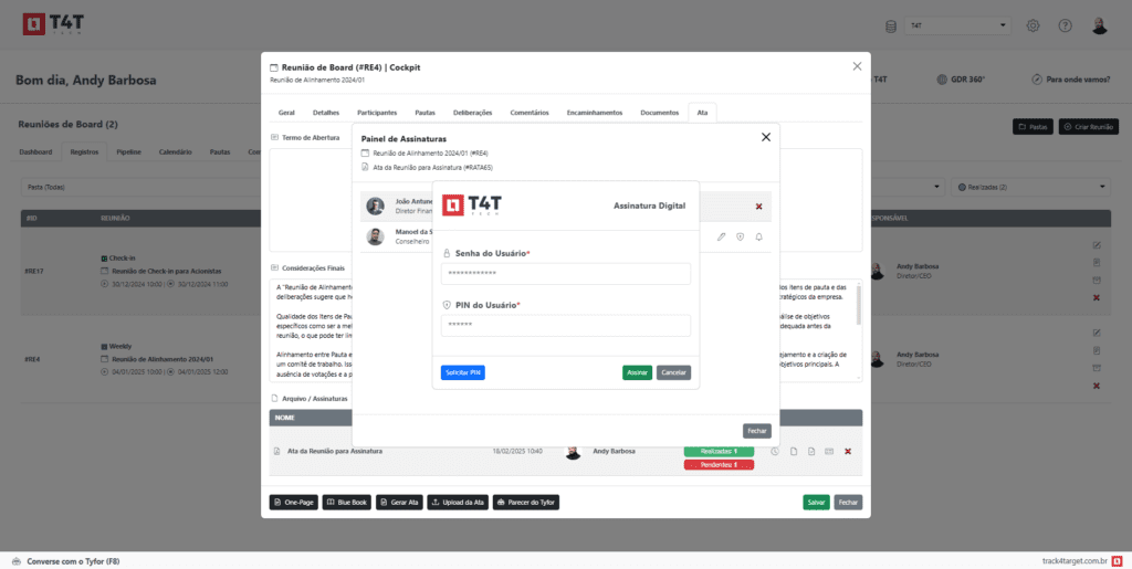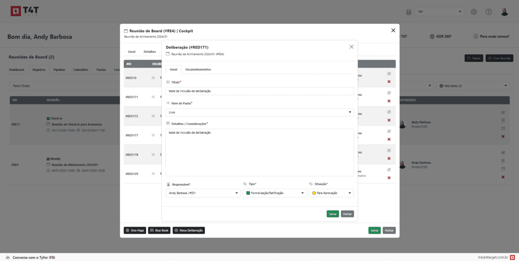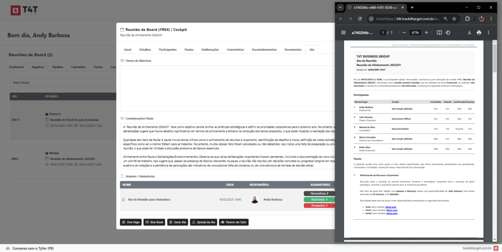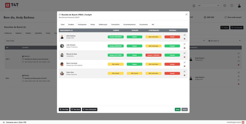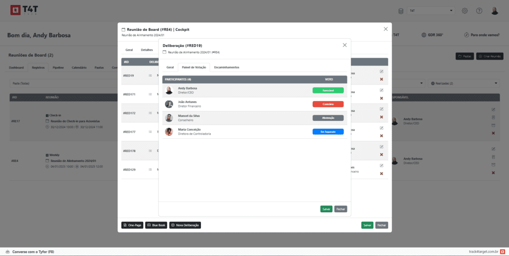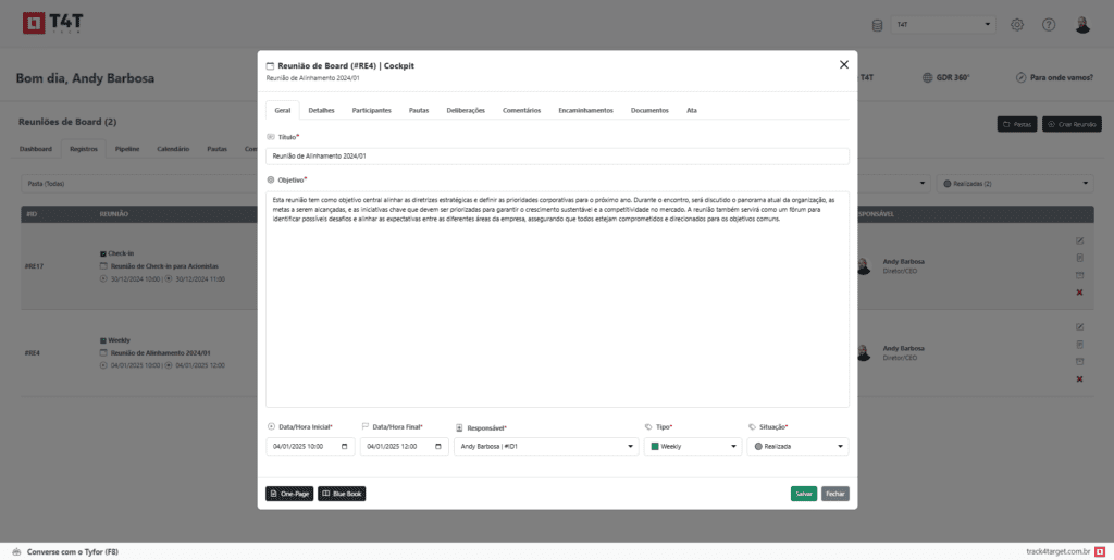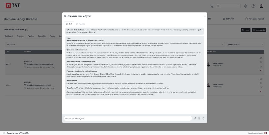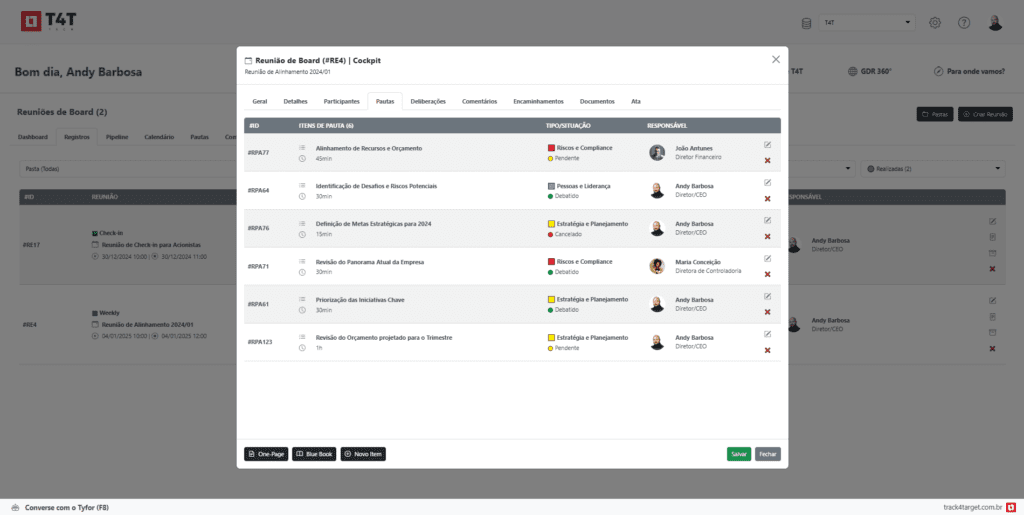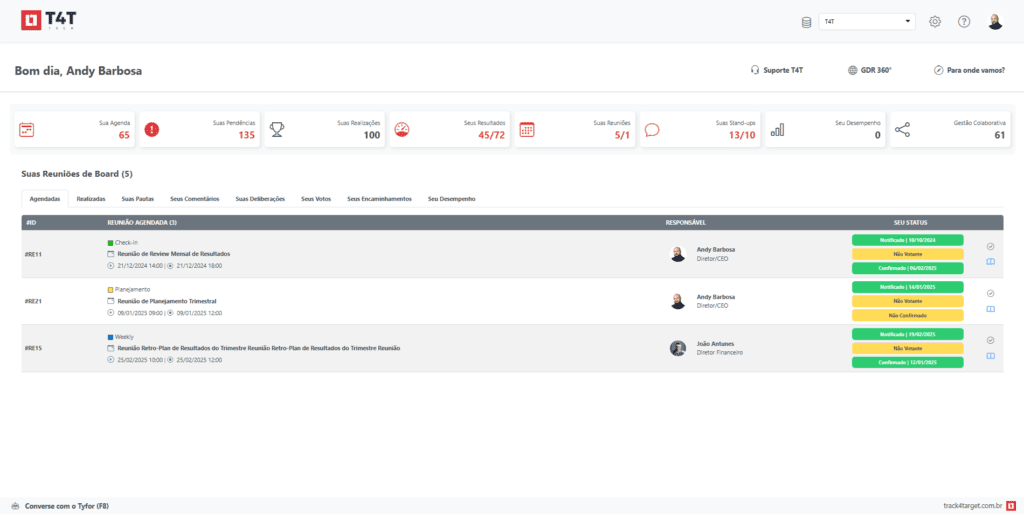 O Módulo de Reuniões da plataforma T4T GDR foi desenvolvido para garantir que todas as reuniões estratégicas, táticas e operacionais sejam organizadas, documentadas e seguras. Desde a criação da pauta até a assinatura digital da ata, o módulo permite um acompanhamento completo de tudo o que foi discutido e decidido, proporcionando transparência, rastreabilidade e eficiência na gestão das reuniões.