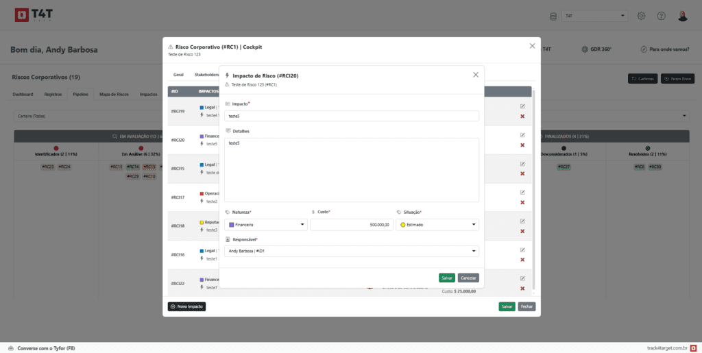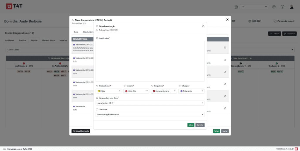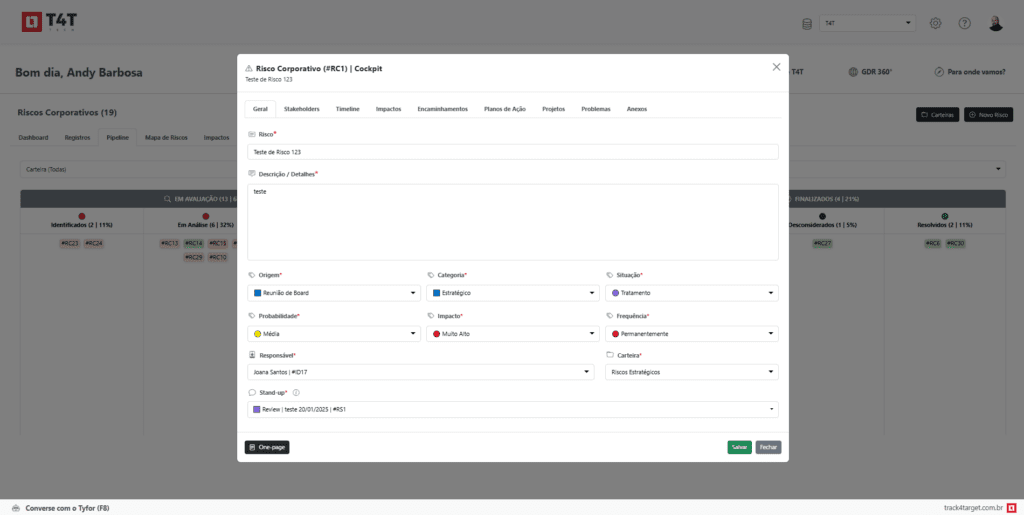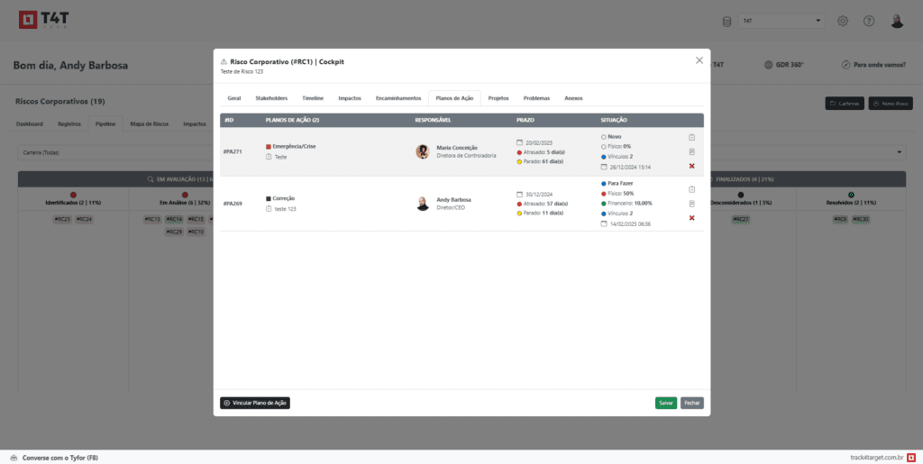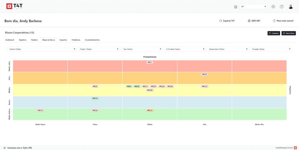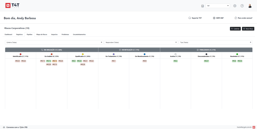 A Gestão de Riscos do T4T GDR um módulo completo para o monitoramento, qualificação e controle dos riscos organizacionais. Ele permite acompanhar o ciclo de vida de cada risco, desde a sua identificação até a mitigação ou encerramento, garantindo total rastreabilidade e transparência no processo. Com funcionalidades como movimentações detalhadas, registros avançados, mapa de riscos dinâmico e integração com projetos e planos de ação, o módulo possibilita uma abordagem estratégica e preventiva para a governança de riscos.