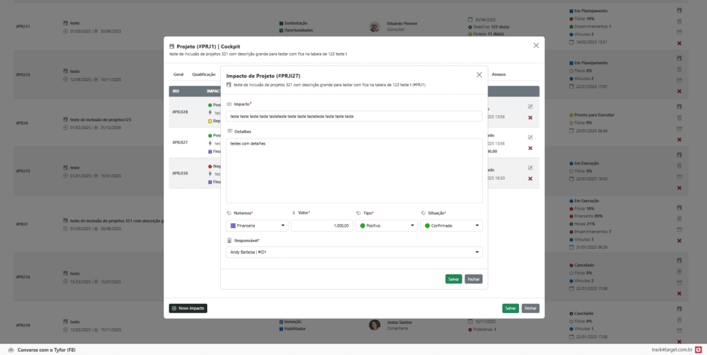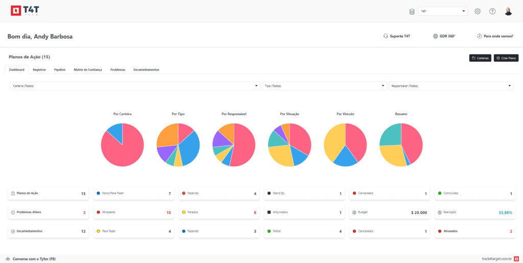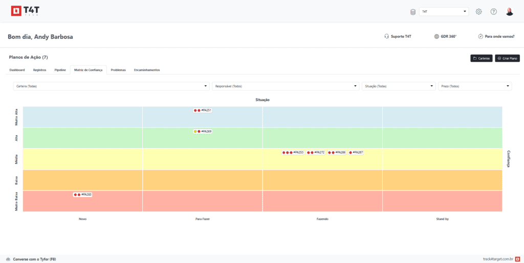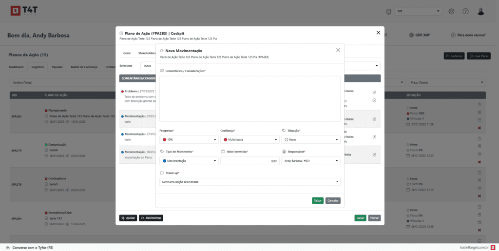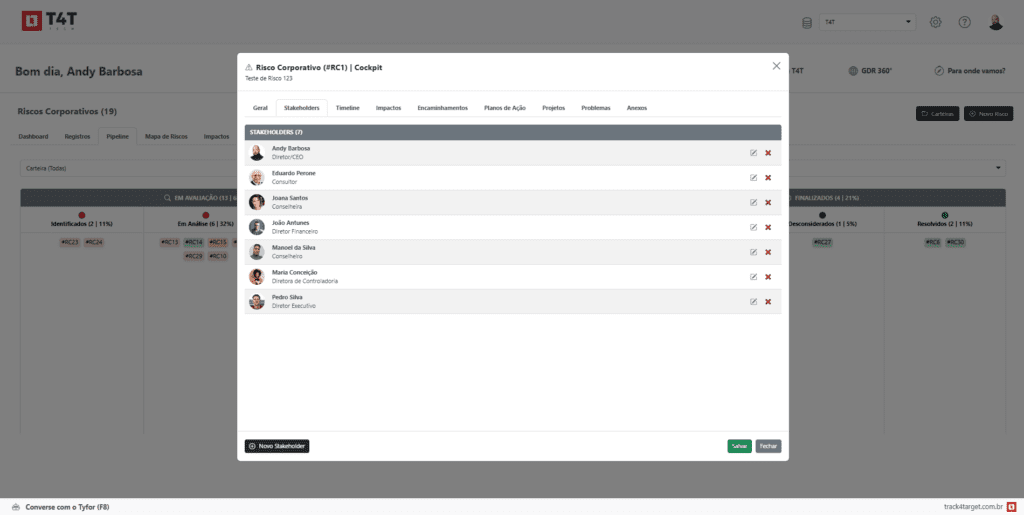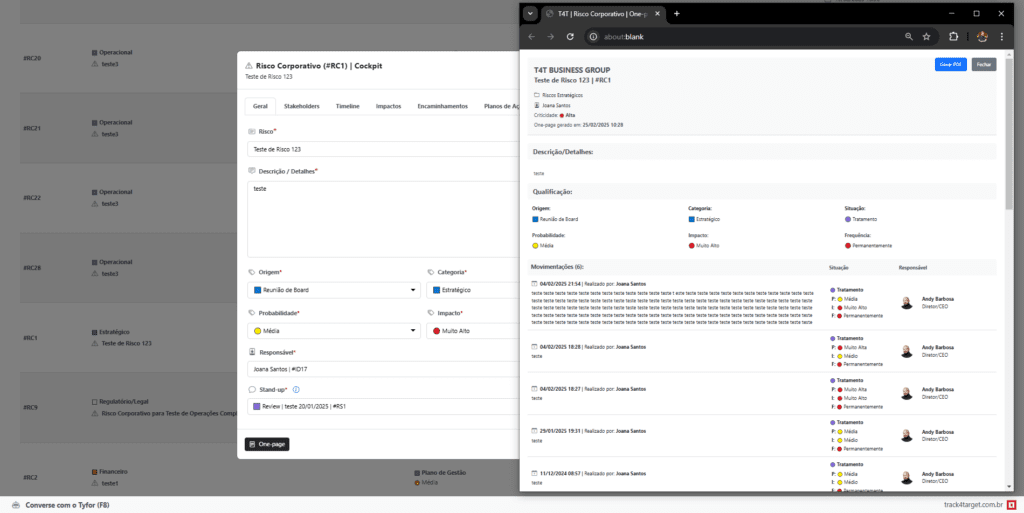 A Gestão de Riscos do T4T GDR um módulo completo para o monitoramento, qualificação e controle dos riscos organizacionais. Ele permite acompanhar o ciclo de vida de cada risco, desde a sua identificação até a mitigação ou encerramento, garantindo total rastreabilidade e transparência no processo. Com funcionalidades como movimentações detalhadas, registros avançados, mapa de riscos dinâmico e integração com projetos e planos de ação, o módulo possibilita uma abordagem estratégica e preventiva para a governança de riscos.