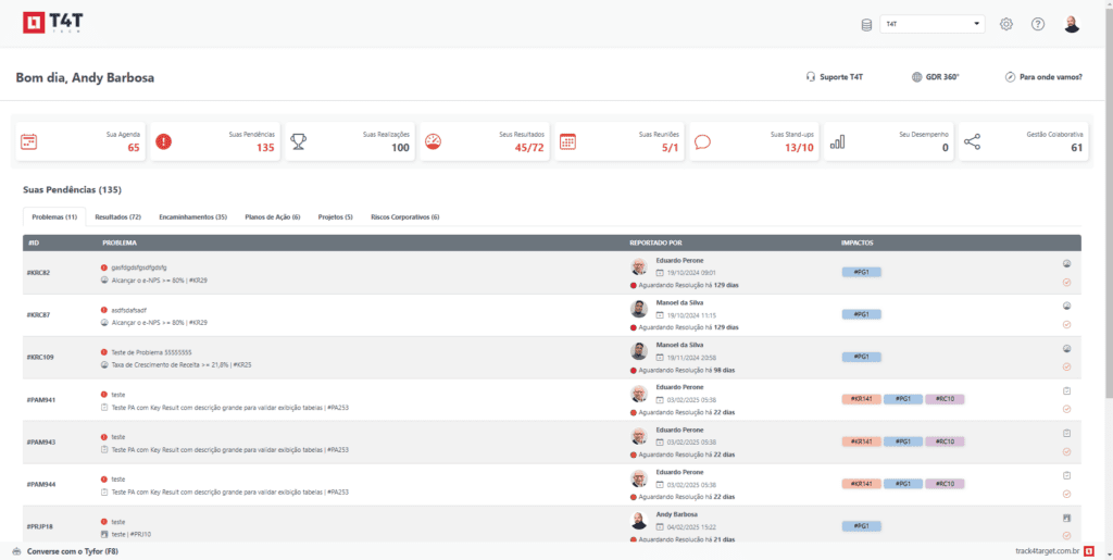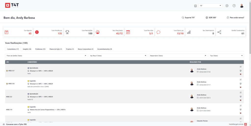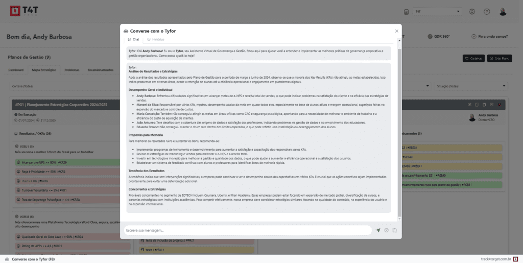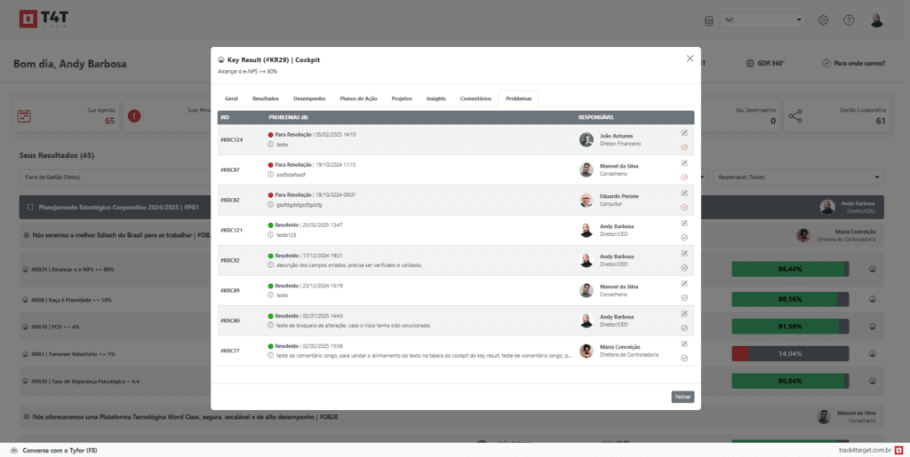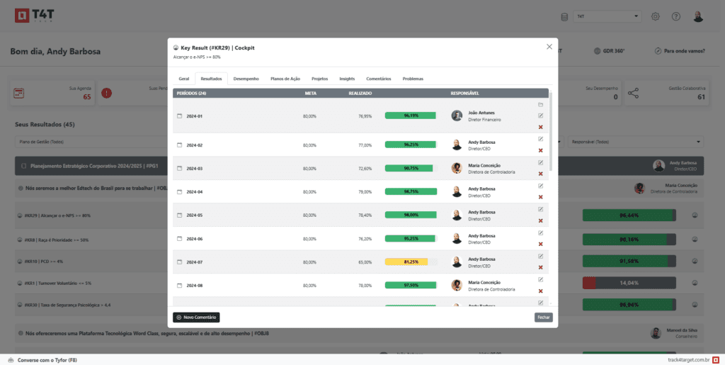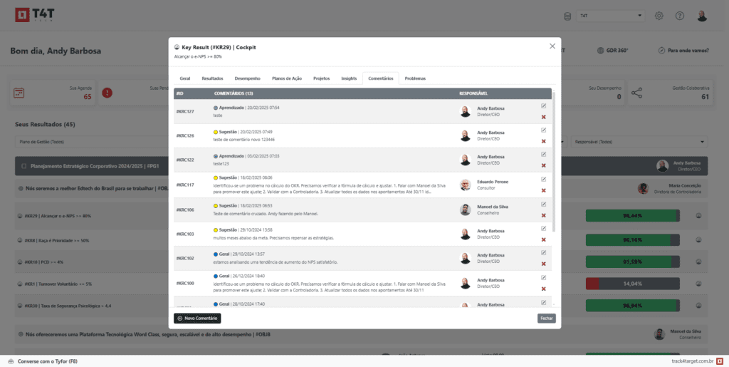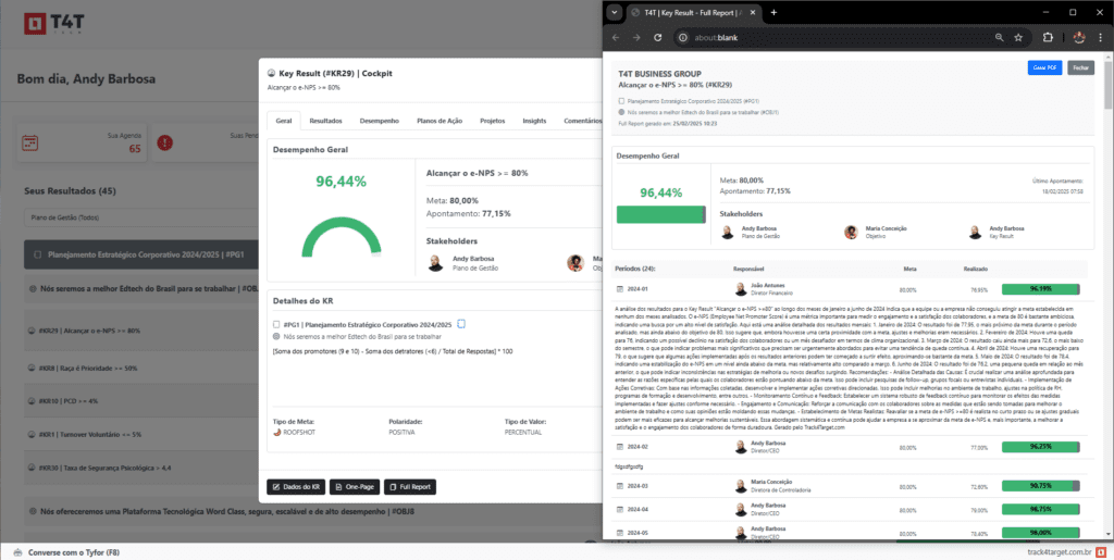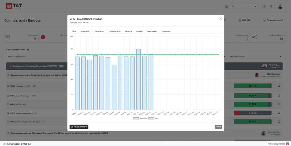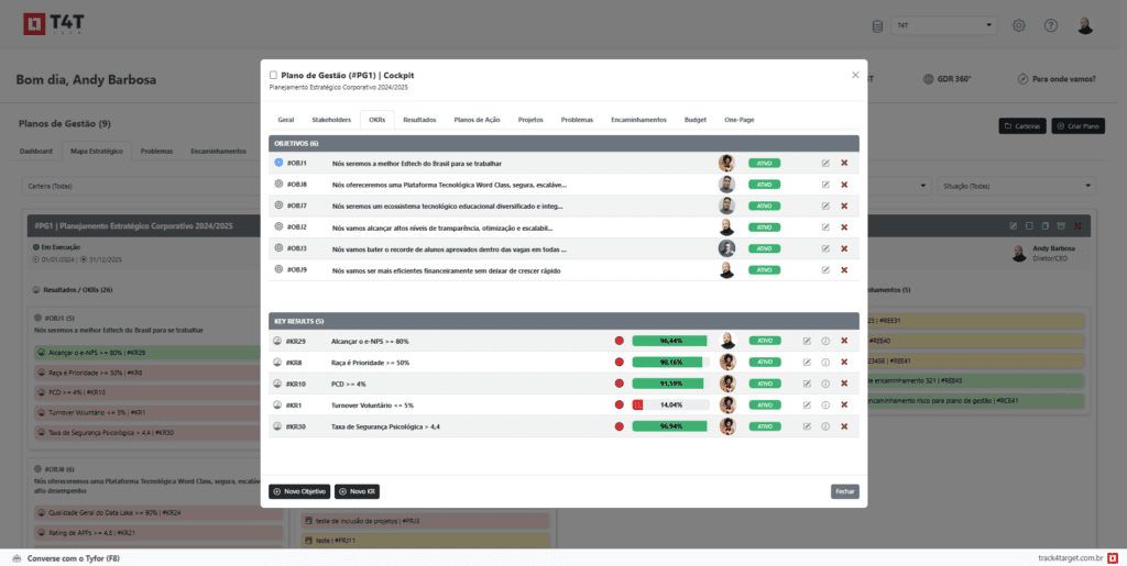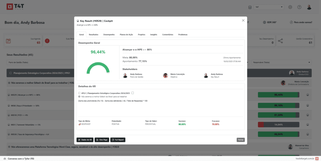O Cockpit do Key Result é o centro de controle da gestão de resultados dentro da plataforma T4T GDR. Projetado para permitir um acompanhamento contínuo e estratégico dos indicadores, ele centraliza todas as informações relevantes para a análise de desempenho e tomada de decisão. Além do registro e monitoramento dos resultados, o módulo incorpora justificativas, evidências, gráficos de evolução, insights colaborativos e avaliação automatizada com IA, garantindo transparência e precisão na gestão dos Key Results.