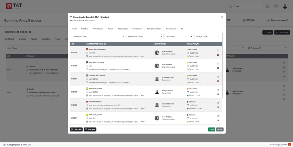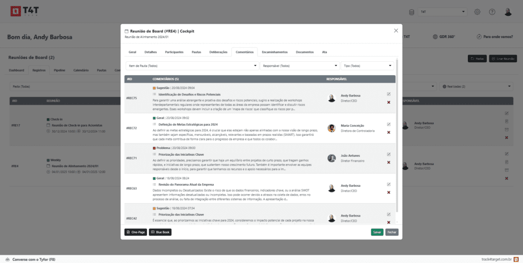 Histórico de stand up’s, reuniões de Board, e comentários vinculados às ações e deliberações.
