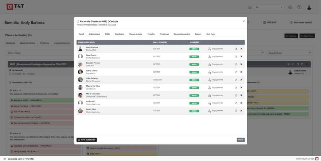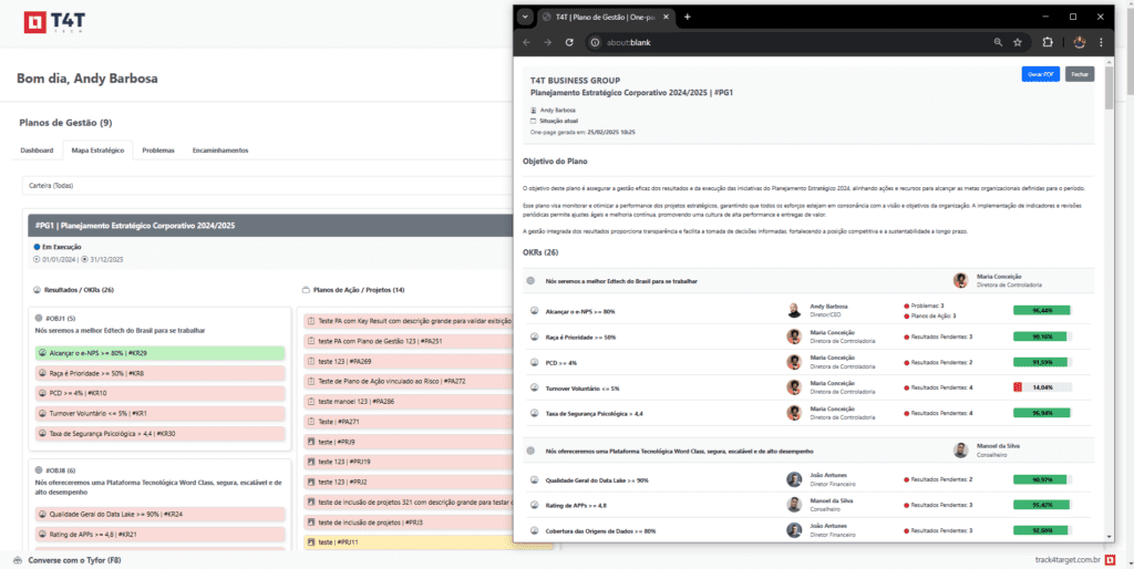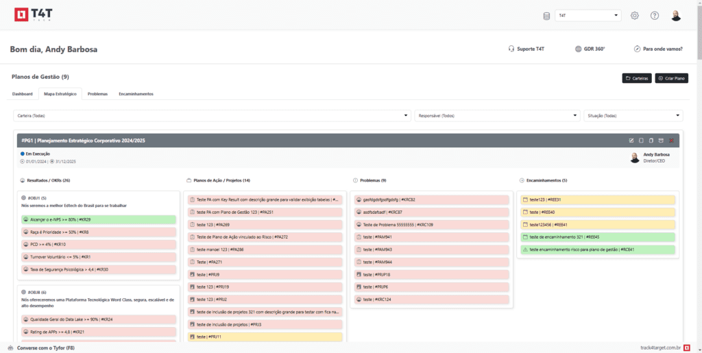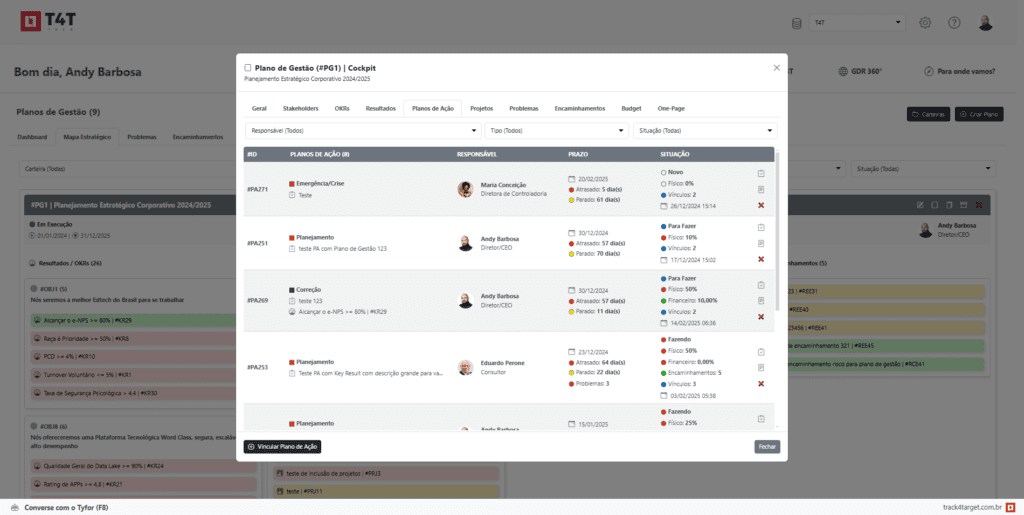 O Módulo de Planos de Gestão e Resultados é a ferramenta essencial para transformar estratégias em ações concretas. Com uma visão integrada, o sistema permite a gestão de mapas estratégicos, incluindo objetivos, key results, planos de ação, projetos vinculados, stakeholders, problemas e encaminhamentos. Tudo isso estruturado para garantir execução eficiente e resultados tangíveis.