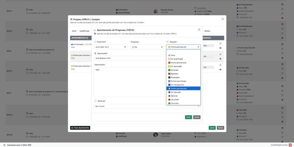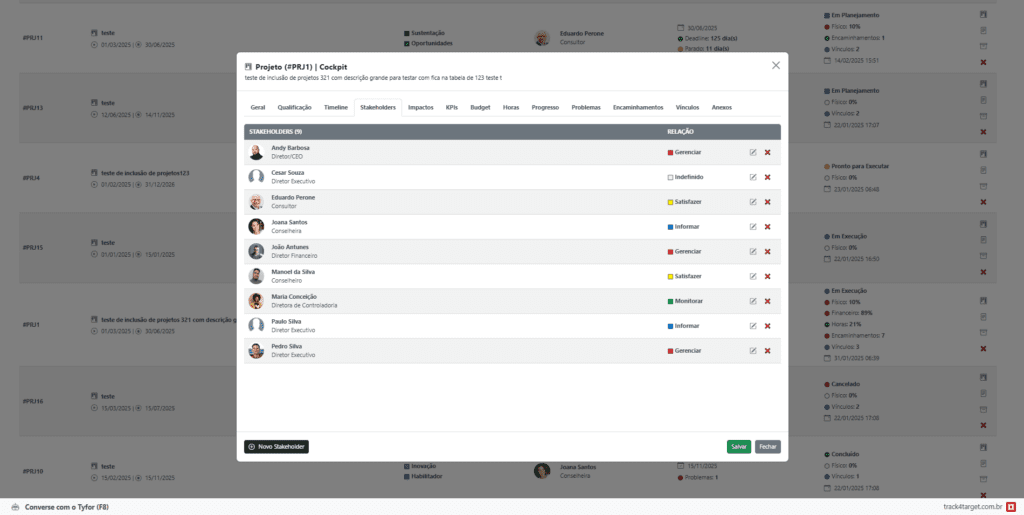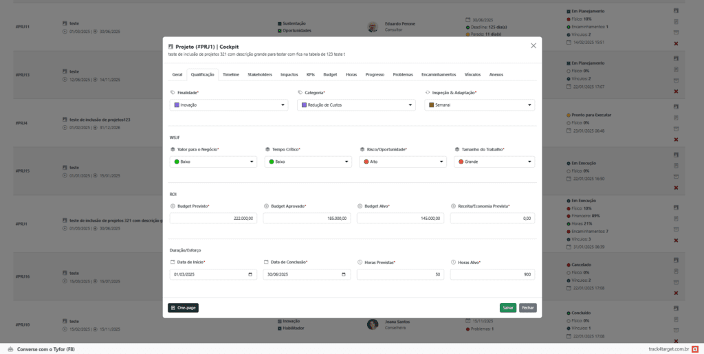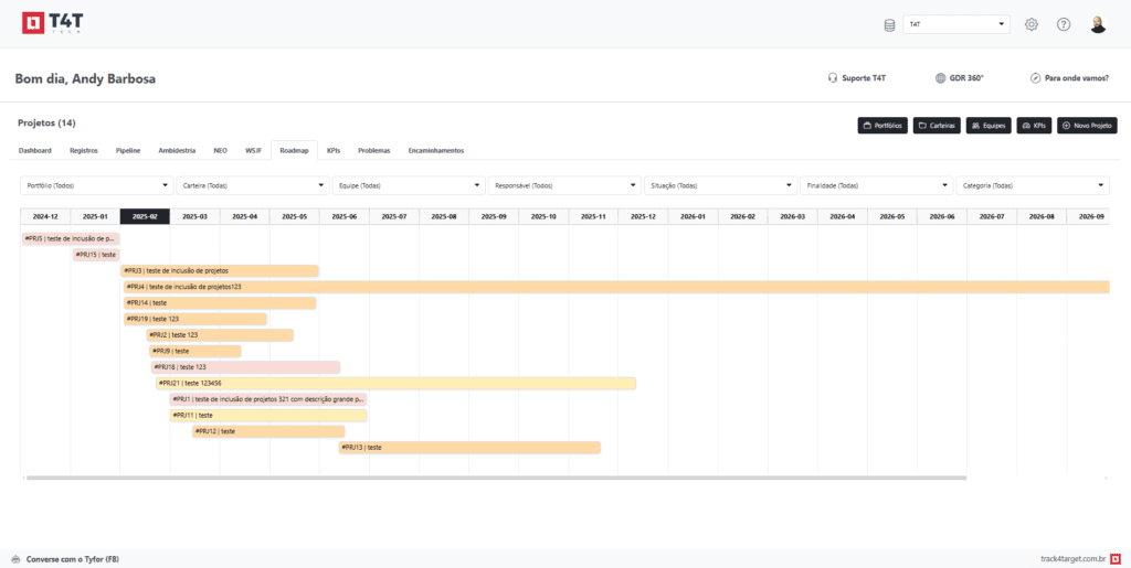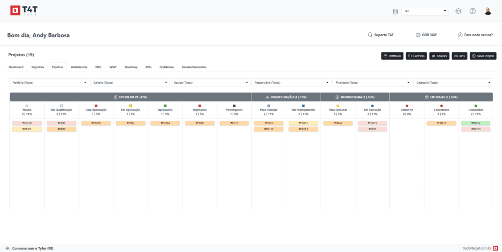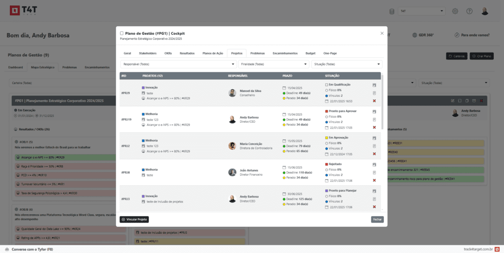 O Módulo de Gestão de Projetos da plataforma T4T GDR foi desenvolvido para garantir que os projetos estejam alinhados à estratégia organizacional e sejam executados com eficiência. Integrado ao ecossistema de governança, o módulo permite um acompanhamento completo, desde o planejamento até a execução, monitorando riscos, entregas, recursos e stakeholders.