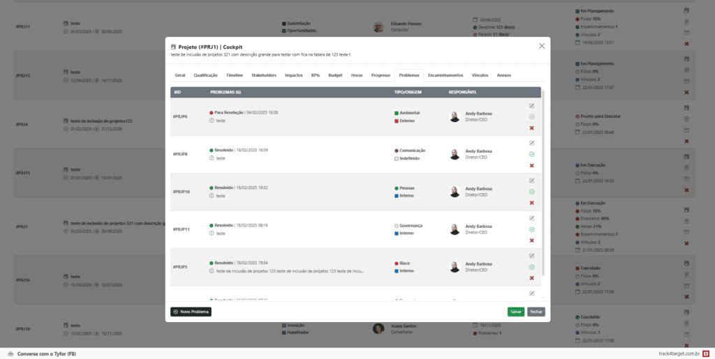 Paineis configuráveis, filtros avançados, e abas específicas para áreas como timeline, problemas e ajustes.