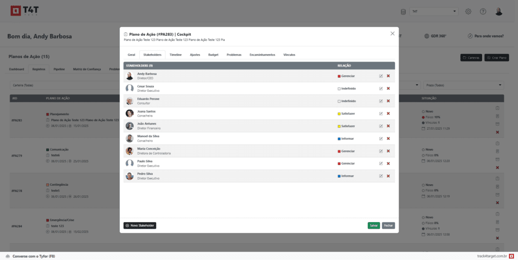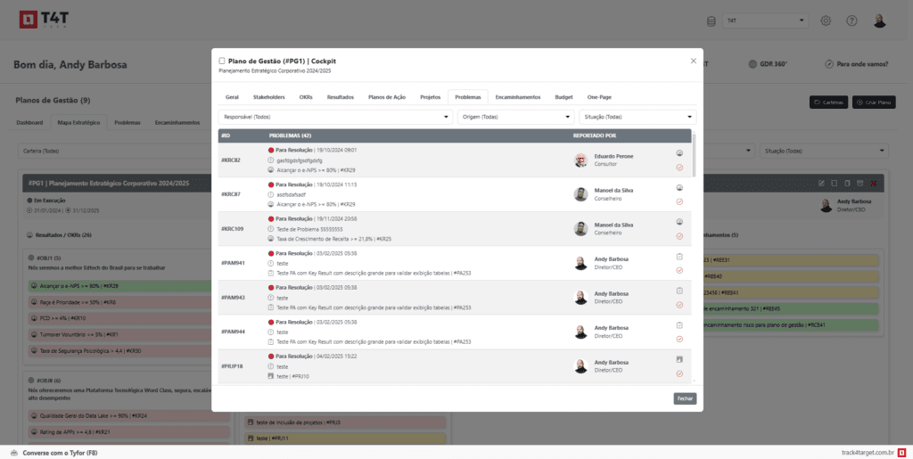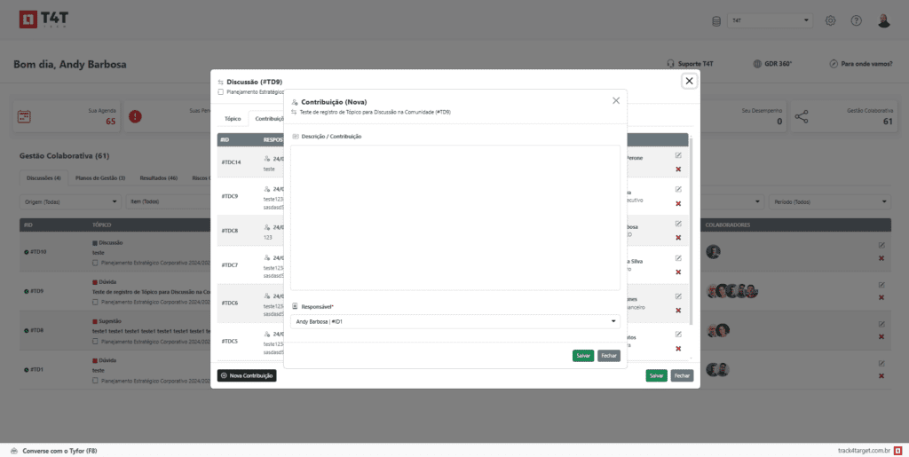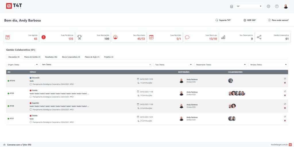 O Módulo de Gestão Colaborativa do T4T GDR é um ambiente inovador para troca de conhecimento, aprendizado contínuo e debate estratégico. Ele permite que stakeholders, gestores e equipes criem tópicos de discussão sobre planos de gestão, key results, projetos, planos de ação e riscos, promovendo um espaço interativo e dinâmico para a governança.